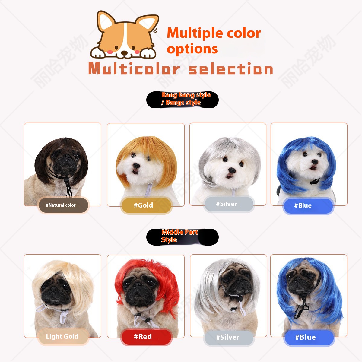 Dog wig bangs bob brown, Dog wig bangs bob orange, Dog wig bangs bob silver, Dog wig bangs bob dark red, Dog wig bangs bob blue, Pet wig linen bob, Pet wig linen middle parted bob, Pet wig red middle parted bob