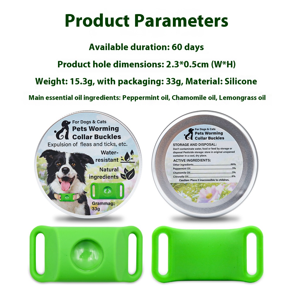| Color | Green insect repellent buckle 1 buckle (1 capsule), Pink anti-mosquito buckle 1 buckle (1 capsule), Black anti-mosquito repellent buckle, single buckle (1 capsule), Gray anti-pest buckle 1 buckle (1 capsule), Blue anti-mosquito repellent button – single pack (1 capsule), Red anti-parasitic collar – 1 collar (1 capsule), Green insect repellent buckle 1 buckle (2 capsules), Pink insect repellent buckle 1 buckle (2 capsules), Black insect repellent buckle 1 buckle (2 capsules), Gray insect repellent buckle 1 buckle (2 capsules), Blue insect repellent buckle 1 buckle (2 capsules), Red insect repellent buckle 1 buckle (2 capsules), Green insect repellent buckle 1 buckle (4 capsules), Pink anti-mosquito buckle 1 buckle (4 capsules), Black anti-mosquito repellent buckle (4 capsules), Gray anti-mosquito repellent buckle (4 capsules), Blue insect repellent buckle 1 buckle (4 capsules), Red anti-parasitic collar with 1 capsule (4 capsules total), Green insect repellent buckle 1 buckle (2 capsules) + 1 silicone dog ring, Pink insect repellent buckle 1 buckle (2 capsules) + 1 silicone dog ring, Black insect repellent buckle 1 buckle (2 capsules) + 1 silicone dog ring, Gray insect repellent buckle 1 buckle (2 capsules) + 1 silicone dog ring, Blue insect repellent buckle 1 buckle (2 capsules) + 1 silicone dog ring, Red insect repellent buckle 1 buckle (2 capsules) + 1 silicone dog ring, Green insect repellent buckle 1 buckle (2 capsules) + 1 silicone dog collar (new standard), Pink insect repellent buckle 1 buckle (2 capsules) + 1 silicone dog collar (new standard), Black insect repellent buckle 1 buckle (2 capsules) + 1 silicone dog collar (new standard), Gray insect repellent buckle 1 buckle (2 capsules) + 1 silicone dog collar (new standard), Blue insect repellent buckle 1 buckle (2 capsules) + 1 silicone dog collar (new standard), Red insect repellent buckle 1 buckle (2 capsules) + 1 silicone dog collar (new standard), Single capsule – bagged |